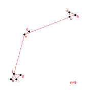 Allerdings lässt sich mit diesem Modell noch reichlich wenig über die SW aussagen. In einem solchen einfachen Netzwerk wie im Beispiel würde die Strecke, die eine Nachricht zurücklegen müsste, um von einem Punkt zum anderen zu gelangen davon abhängen, wie viele Nachbarn zwischen den beiden Punkt liegen. Dieser Weg ist als Länge oder auch Distanz mit der Variable L angegeben. So ist der kürzeste Weg zwischen g und f genau L=1, da diese keinen Hub zwischen sich haben, während der kürzeste Weg von e nach f, zwischen denen h und g liegen, 3 Schritte (L=3) beinhaltet. Diese Zahl steigt expotential mit der Anzahl der Hubs. Der durchschnittliche Wert von 6, den Dodds, Muhamad & Watts (2003) und Milgram (1967) fanden, wäre, wenn die Gesellschaft in dieser Weise organisiert wäre, nicht zu erreichen.